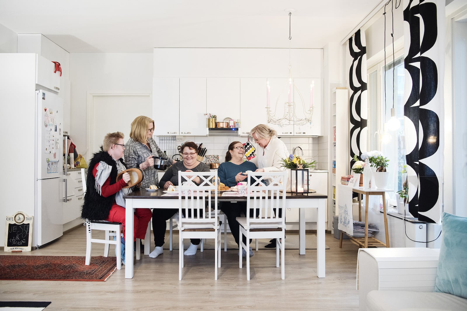 Tiina (oik) kertoo, että keittiö on heidän kotinsa sydän. Siellä kokoonnutaan usein kahvittelemaan ja pölisemään. Jesse (vas) tarvitsee hoitajia koko ajan. Varamummo Maija kaataa kahvia Tiinan ystävälle Vuokolle. Tiina puolestaan tarjoaa kakkua Loivahoivan hoitajalle Päiville.