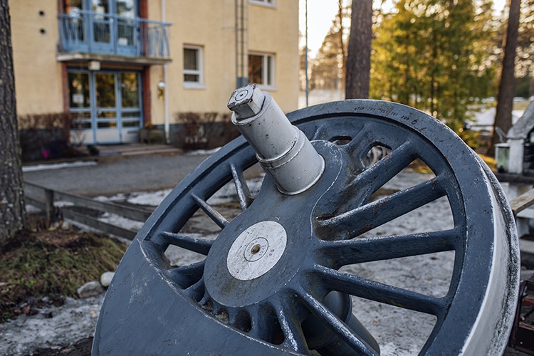 Höyryveturi Riston vetopyörä muistuttaa Tienhaarankuja 12:sta historiasta.