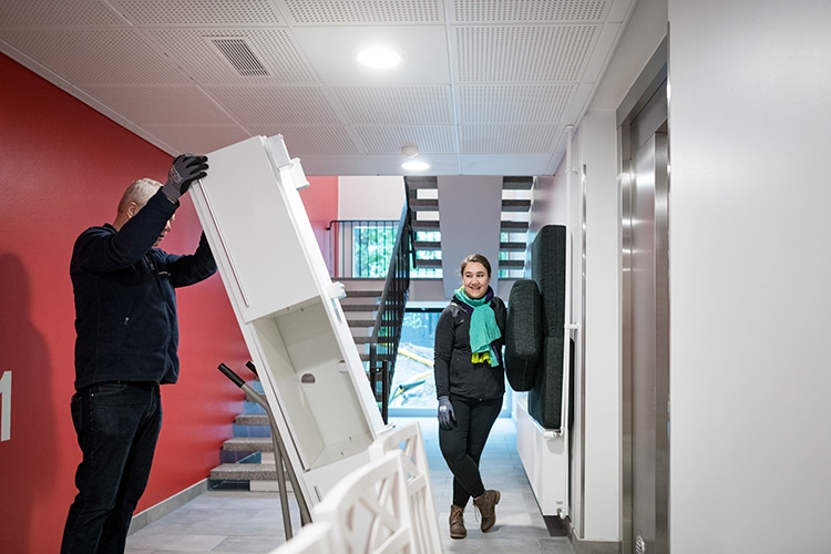 Banaanilaatikko toisensa jälkeen pakettiauto tyhjenee. Laatikot ja huonekalut siirtyvät uudelta rakennukselta tuoksuvassa hississä perille oikeaan kerrokseen.