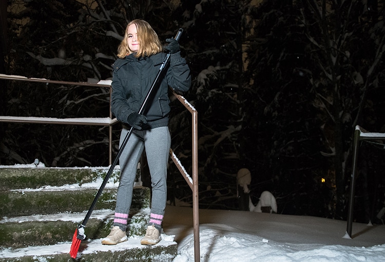 “Me tulemme lapioinemme ja harjoinemme töihin, kun lunta on vähintään viisi senttimetriä. Putsaamme kulkuväylät 13 rappuun sekä roskakatokselle. Lisäksi hiekoitamme väylät tarvittaessa”, Pinja sanoo.