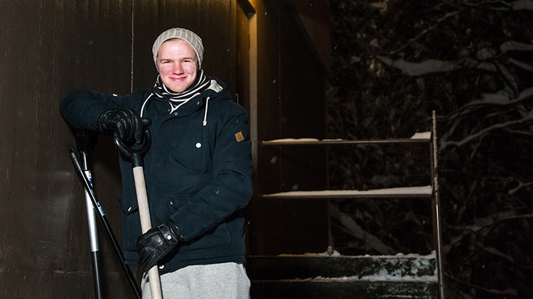 Esa tekee lumitöitä M2-Kotien palkkaamana vuoroviikoin myös samassa pihapiirissä asuvien Pinja Leijoen ja Jessica Kivimäen kanssa.