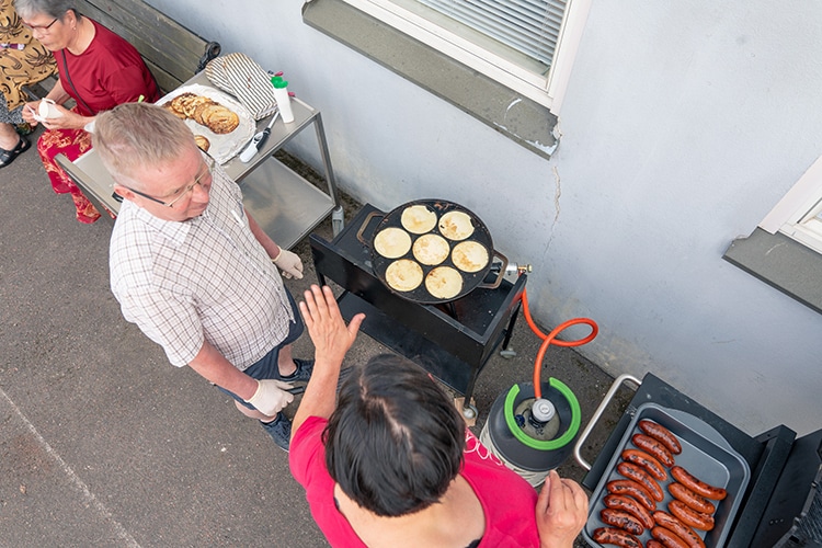 He ja Liisi vastaavat grillijuhlien ruuanlaitosta. Tarjottavien määrä arvioidaan edellisvuosien kokemuksella, eikä ilmoittautumista vaadita. Jos makkaroita jää yli, ne pakastetaan seuraavaa kertaa varten. Tärkeintä on, ettei mikään lopu kesken.