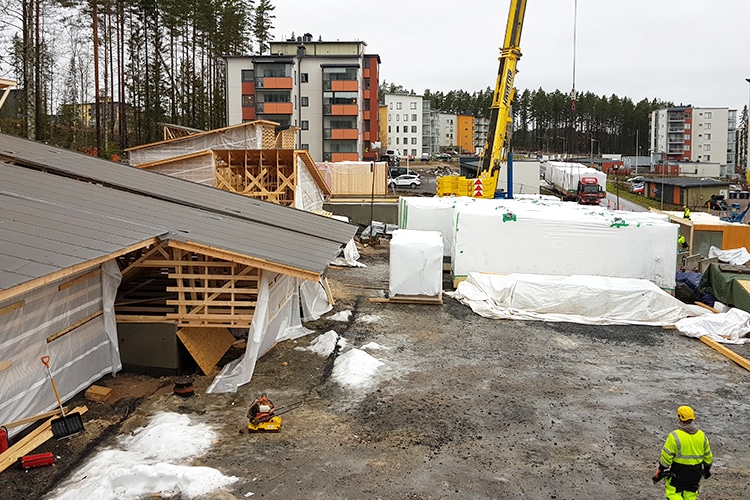 Paikan päällä ne nostetaan rakennuspalikoiden tapaan paikalleen ja talo nousee kerros kerrokselta.