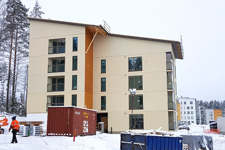 Menetelmä on lisäksi kustannustehokas. Vuosikymmenet suomalainen kerrostalo on rakennettu betonielementeistä, mutta nyt sen varteenotettavaksi kilpailijaksi on tullut puu. Koko kerrostalo kootaan massiivipuusta rakennetuista tilaelementeistä.