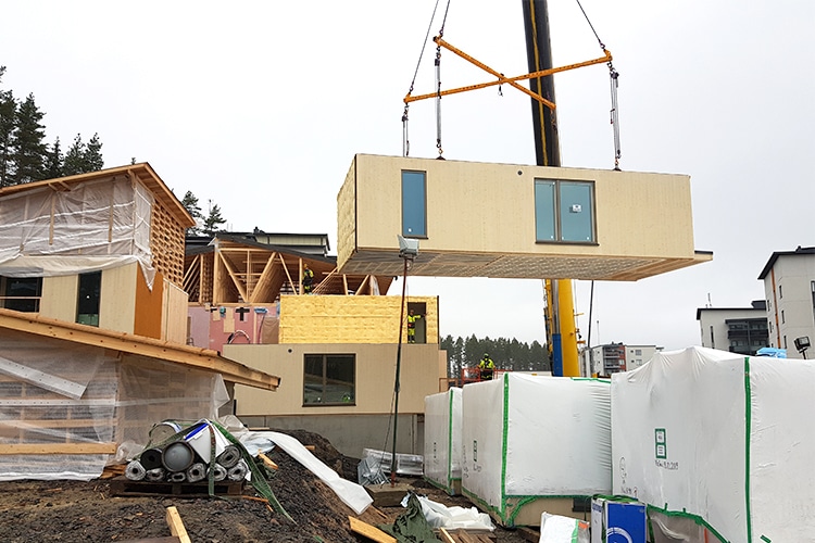 Puurakentamisessa valmiit asunnot nostetaan paikalleen asunto kerrallaan.