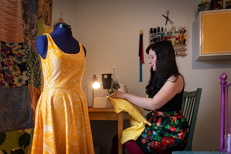 Makuuhuoneeseen on tehty Lotan ompelupiste. Sen ompelukonekin on aidosti retroa, Tori.fi:n löytöjä. Lotta ompelee kotiinsa muun muassa verhoja ja tyynynpäällisiä kierrätyskankaista. Kangaskokoelma on puolestaan kerätty vanhaan metalliseen arkistokaappiin, jonka Lotta on maalannut vihreäksi.