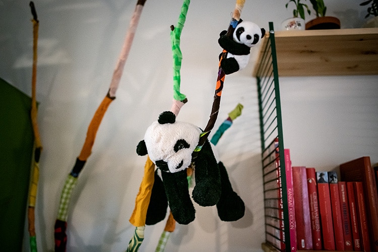 Kukkaruukusta kurkistaa kissanaamari ja rehevän köynnöskasvin oksat keikkuvat katossa yhdessä koristeviirien kanssa. Sisustuspuun oksilla loikoilee pehmopandoja. Lähes kaikki kodissa on kierrätettyä ja harkiten ostettua.