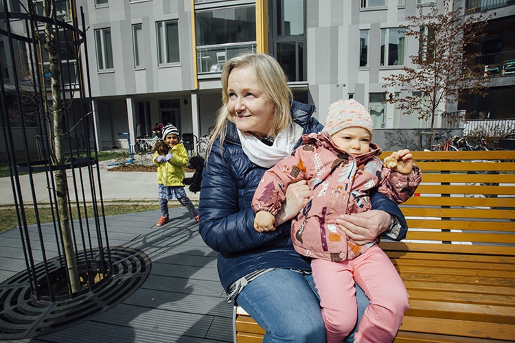 Lastensa Lumin ja Adamin kanssa pihalle tullut Sonja Berroud pohtii suomalaisten suhtautumista toisiin ylipäätään. “Yleensä suomalaiset katsovat hississä lattiaan, täällä katsotaan silmiin. Se on aika harvinaista, mutta kuvaa talon henkeä”, Berroud sanoo.