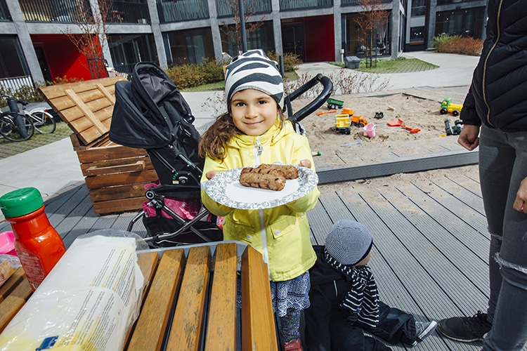 Sonja Vesala raottaa kaasugrillin kantta ja kurkistaa ritilällä paistuvia makkaroita. Ihana, kesää enteilevä tuoksu leviää helsinkiläisen Juutinraumankatu 10:n sisäpihalla. Toukokuinen lauantai on M2-Kodin asukkaille jokakeväinen perinne: Tänään korjataan pyöriä ja avataan grillikausi.
