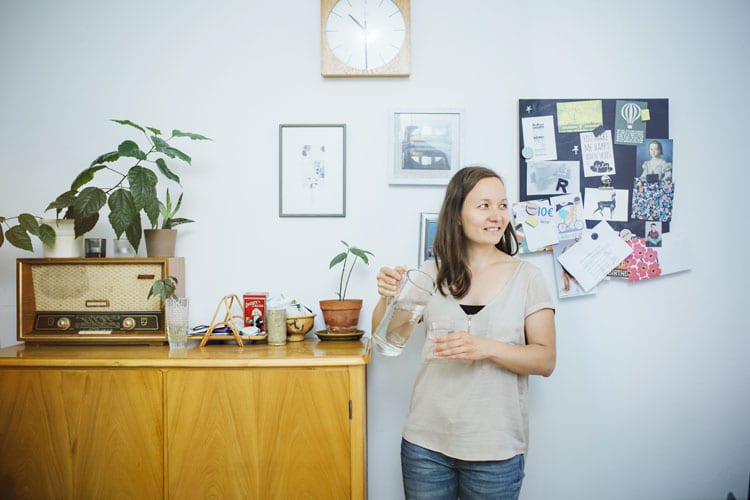 Isoisältä peritty kaunis vesikannu koristaa Kaisa Rapasen, 33, keittiönpöytää. Janon iskiessä hän ei juoksuta vettä hanasta, vaan kaataa veden lasiin kannusta. Ylimääräiset vedet esimerkiksi vedenkeittimestä pääsevät virkistämään kodin kukkia.