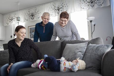 Elina perheineen ja hänen vanhempansa muuttivat samaan M2-Kotien taloon. Arki kaksosten kanssa helpottuu, kun apua on saatavilla vain muutamaa kerrosta ylempänä.