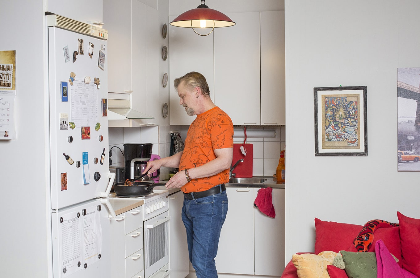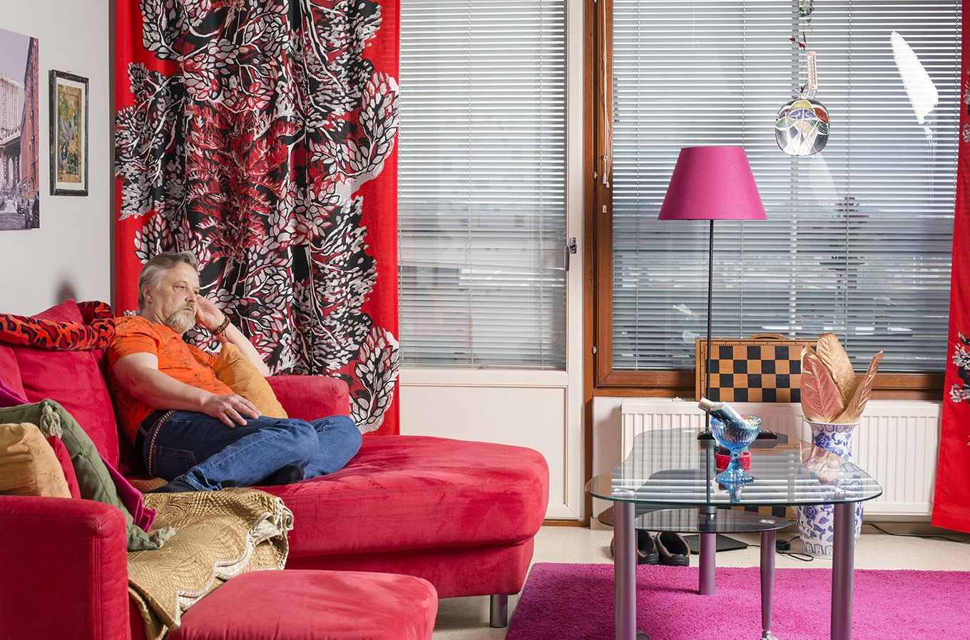 Jari Murtosen koti on täynnä värejä. Sohva on räiskyvän punainen, ja tyynyjen päällä makaa punasävyinen pehmoboa. Seinillä on mustavalkoista ja värikuvaa yhdisteleviä, New Yorkia esittäviä valokuvatauluja. Asukas itse on pukeutunut oranssiin paitaan.